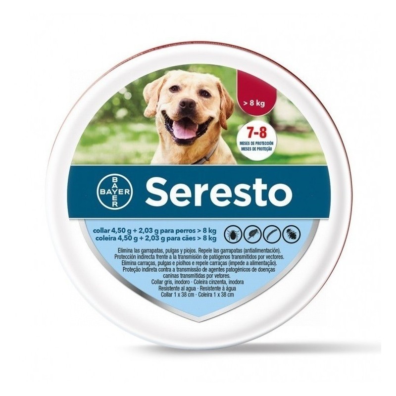 [PERROS] (más de 8 kg): - Prevención (Ctenocephalides felis, C. Canis) y tratamiento de la [INFESTACION POR PULGAS (VET)] (Ctenocephalides felis) durante 7-8 meses. Protege el entorno inmediato del animal al inhibir el desarrollo de larvas de pulga durante 8 meses. - Tratamiento de la [DERMATITIS ALERGICA POR PULGAS (VET)] (DAPP). - Eficaz contra las [INFESTACION POR GARRAPATAS (VET)] durante 8 meses por su efecto repelente (antialimentación) (Ixodes ricinus, Rhipicephalus sanguineus) y su efecto acaricida (muerte del parásito) (Ixodes ricinus, Rhipicephalus sanguineus, Dermacentor reticulatus). Eficaz contra larvas, ninfas y garrapatas adultas. - Protección indirecta frente a la transmisión de los patógenos Babesia canis vogeli ([BABESIOSIS (VET)]) y Ehrlichia canis por la garrapata Rhiphicephalus sanguineus y en consecuencia, se disminuye el riesgo de babesiosis canina y ehrliquiosis canina durante 7 meses. - Tratamiento de la infestación por piojos picadores/masticadores (Trichodectes canis). - Reducción del riesgo de [LEISHMANIOSIS (VET)] infantuma través de la transmisión por flebotomos hasta 8 meses.