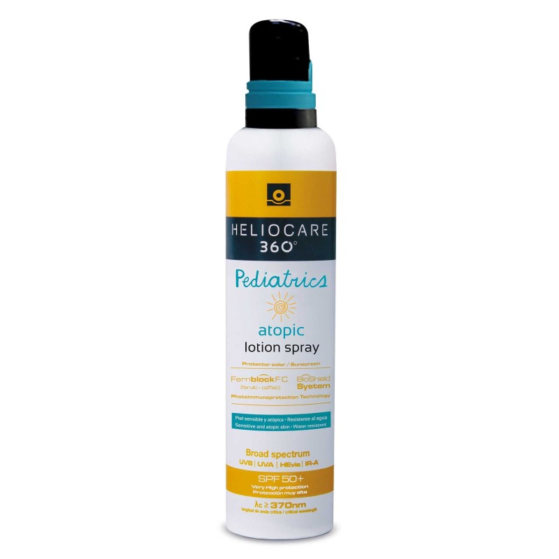Heliocare 360º Pediatrics Atopic Lotion Spray, es un fotoprotector pediátrico especialmente indicado para pieles atópicas, de fácil aplicación, resistente al agua, con SPF 50+ y cobertura frente a las cuatro radiaciones solares: UVB, UVA, Visible e IR.