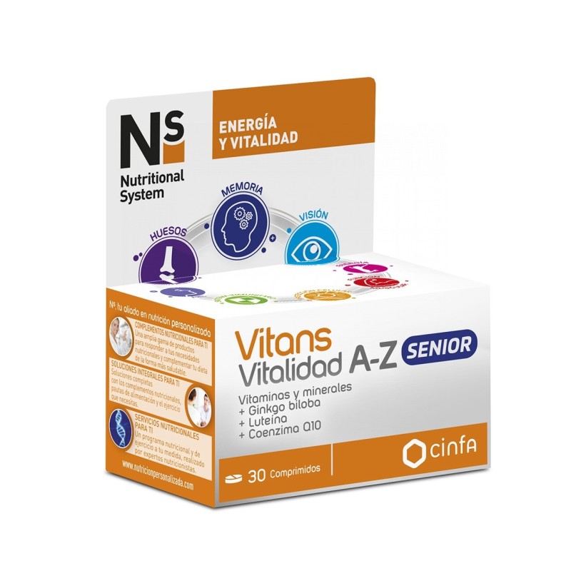 Descripción: Ns Vitans Vitalidad A-Z Senior es un complemento nutricional diseñado específicamente para las necesidades del público senior, especialmente para aquellos mayores de 50 años. Formulado con 13 vitaminas, 11 minerales, luteína y coenzima Q10, este suplemento ayuda a mantener la vitalidad física y mental en personas que pueden tener requerimientos nutricionales más altos debido a diversos factores como la falta de una dieta equilibrada, la práctica de ejercicio físico, o situaciones de sobresfuerzo mental.