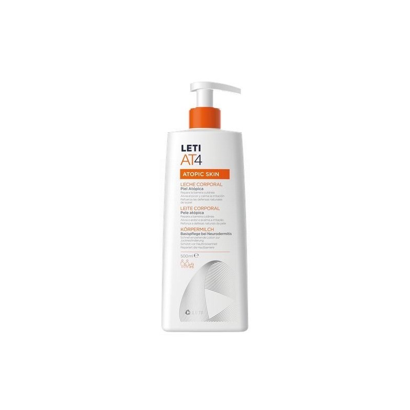 LETI AT-4 LECHE CORPORAL ES UNA EMULSIÓN FLUIDA DE FÁCIL APLICACIÓN Y UN ALTO PODER EMOLIENTE. SE TRATA DE UNA LECHE CORPORAL PERFECTA PARA APLICAR EN ZONAS CORPORALES EXTENSAS. ESTÁ INDICADO PARA TODO TIPO DE PERSONAS, BEBÉS, NIÑOS Y ADULTOS QUE TENGAN PIELES ATÓPICAS, SECAS Y SENSIBLES.EN EL CASO DE LOS ADULTOS,LETI AT-4 LECHE CORPORAL TAMBIÉN ESTÁ RECOMENDADO PARA AQUELLOS QUE TENGAN PIELES HIPERREACTIVAS Y SENSIBLES.